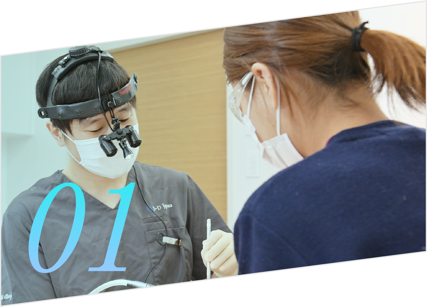 一般的な保険診療に加え、インプラント治療・歯周病治療・矯正治療を含んだ包括的歯科治療を学んでいただけます。歯科医師1名に対し、マイクロスコープ1台を完備しているので、精密根管治療などの質の高い治療も学んでいただけます。