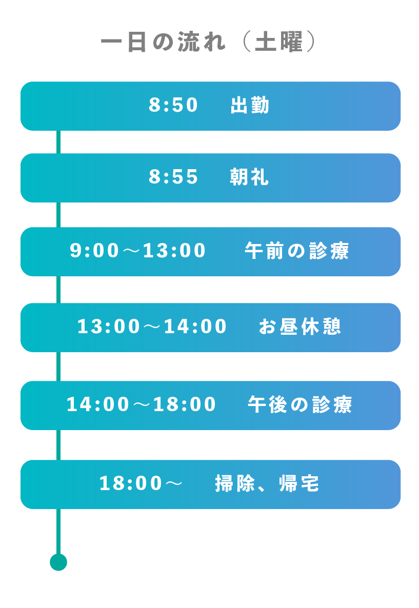 | 診療時間 | ■月・火・水・金 午前9時〜13時、午後15時〜19時 ■木・土 午前9時〜13時、午後14時〜18時 (出勤時間は8時50分)、早番遅番あり |
