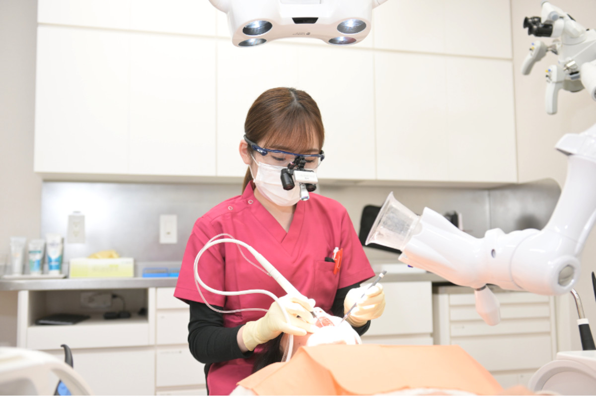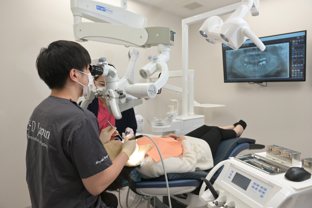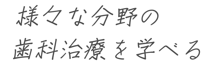一般的な保険診療に加え、インプラント治療・歯周病治療・矯正治療を含んだ包括的歯科治療を学んでいただけます。歯科医師1名に対し、マイクロスコープ1台を完備しているので、精密根管治療などの質の高い治療も学んでいただけます。