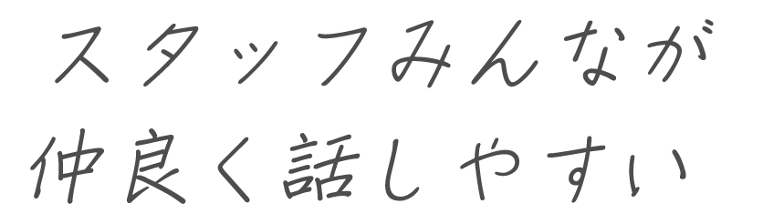 お互いの意見や想いを伝えやすい職場作りを心がけています。スタッフ同士のコミュニケーションも活発で、主体性を持ち伸び伸びと働ける環境になっています。