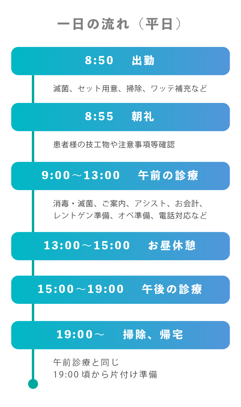 | 診療時間 | ■月・火・水・金 午前9時〜13時、午後15時〜19時 ■木・土 午前9時〜13時、午後14時〜18時 (出勤時間は8時50分)、早番遅番あり |