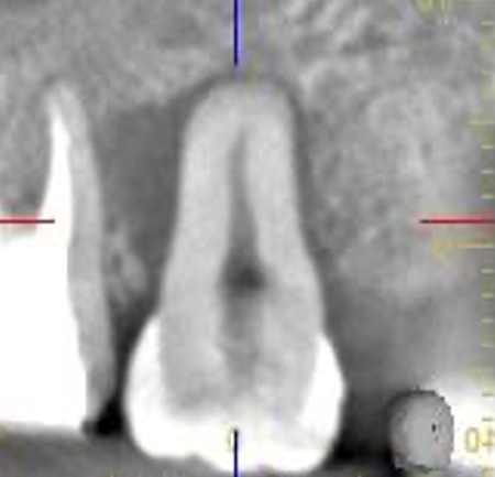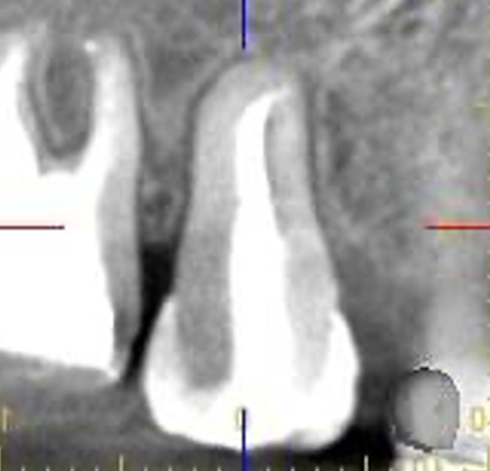| STEP3 移植後レントゲン | STEP4 5ヶ月後レントゲン (歯槽硬線と歯根膜腔が認められる) |